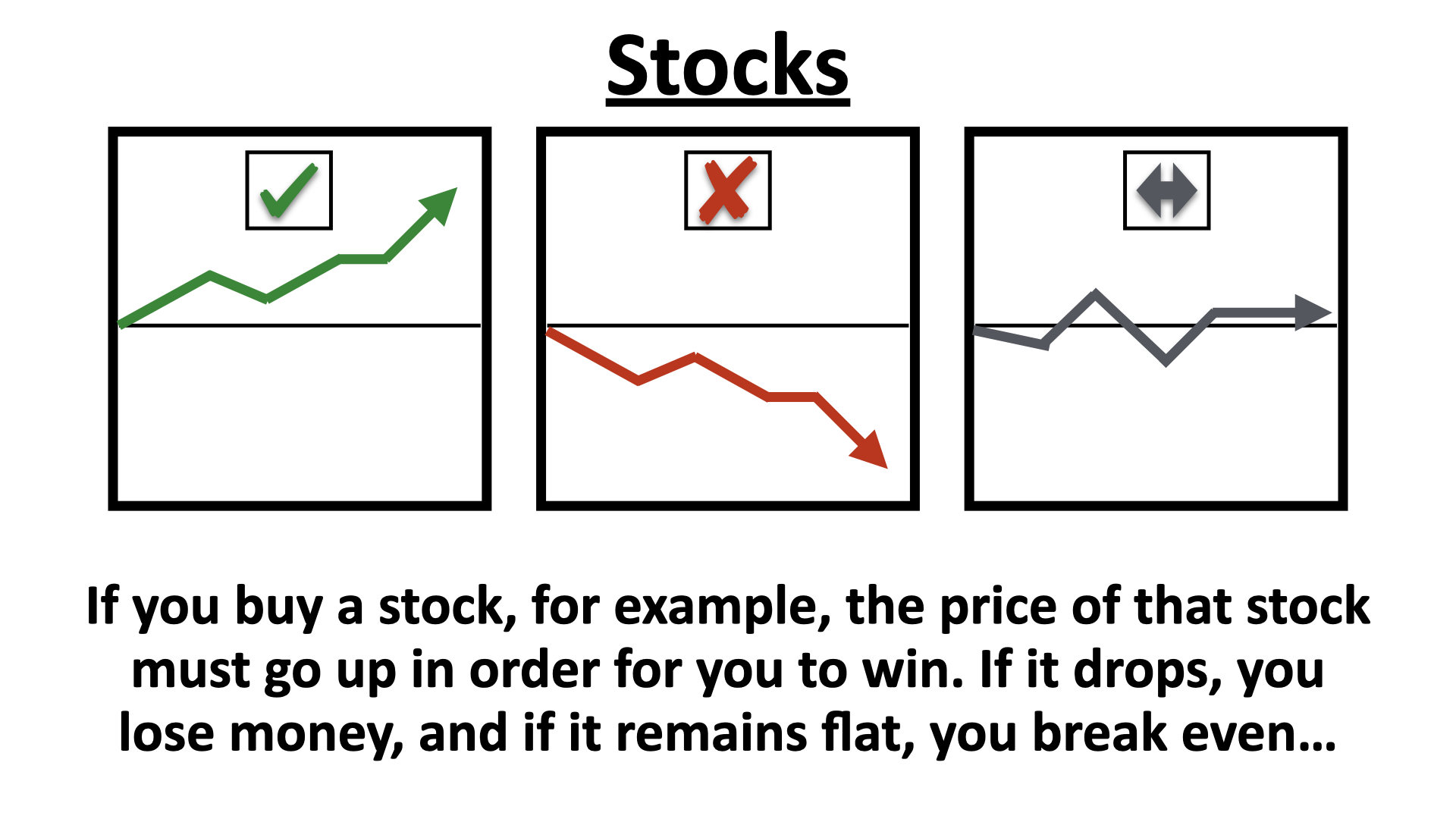 If you buy a stock, for example, the price of that stock must go up in order for you to win. If it drops, you lose money, and if it remains flat, you break even…